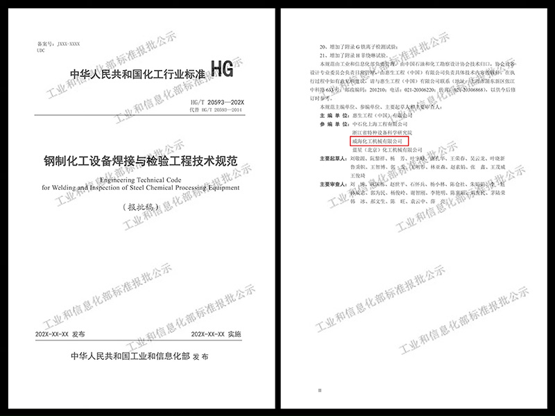 威?;瘷C(jī)作為專業(yè)從事高端化工裝備研發(fā)、設(shè)計與制造一體化服務(wù)的國家高新技術(shù)企業(yè),在化工裝備領(lǐng)域深耕四十多年,積累了豐富的行業(yè)設(shè)計及制造經(jīng)驗,多年來始終高度重視化工行業(yè)的標(biāo)準(zhǔn)化工作,共計參與國家標(biāo)準(zhǔn)、行業(yè)標(biāo)準(zhǔn)、團(tuán)體標(biāo)準(zhǔn)七項。